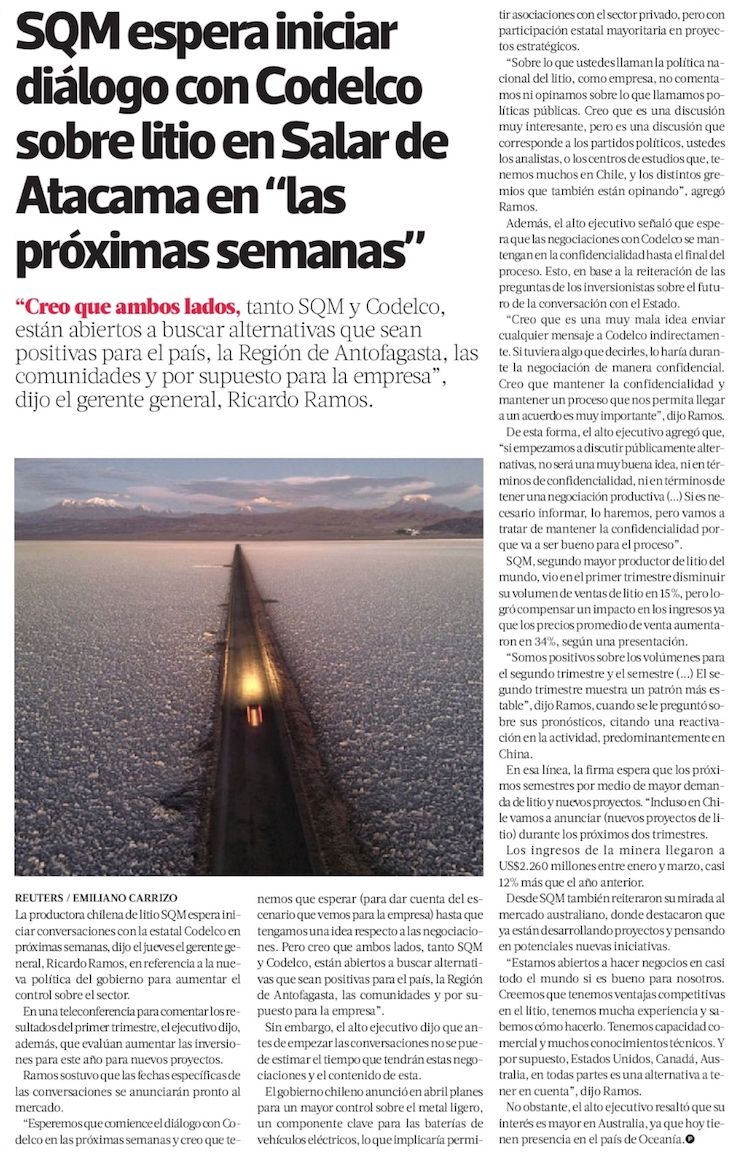 SQM se pone plazos para negociación con Codelco y ve nuevos proyectos incluso en Chile - (El Mercurio de Santiago)