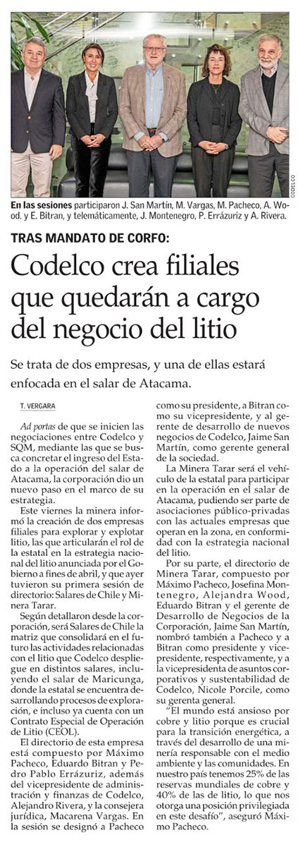 Salares Chile y Minera Tarar: Codelco anuncia la creación de dos filiales para desarrollar el negocio del litio - (emol)