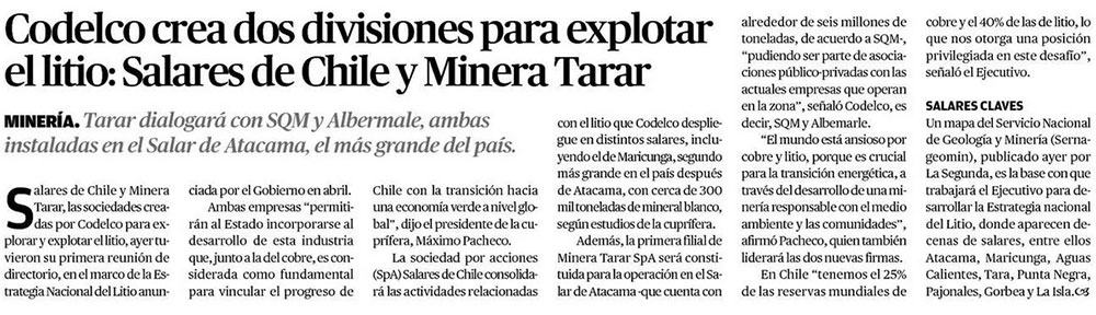 Salares Chile y Minera Tarar: Codelco anuncia la creación de dos filiales para desarrollar el negocio del litio - (emol)