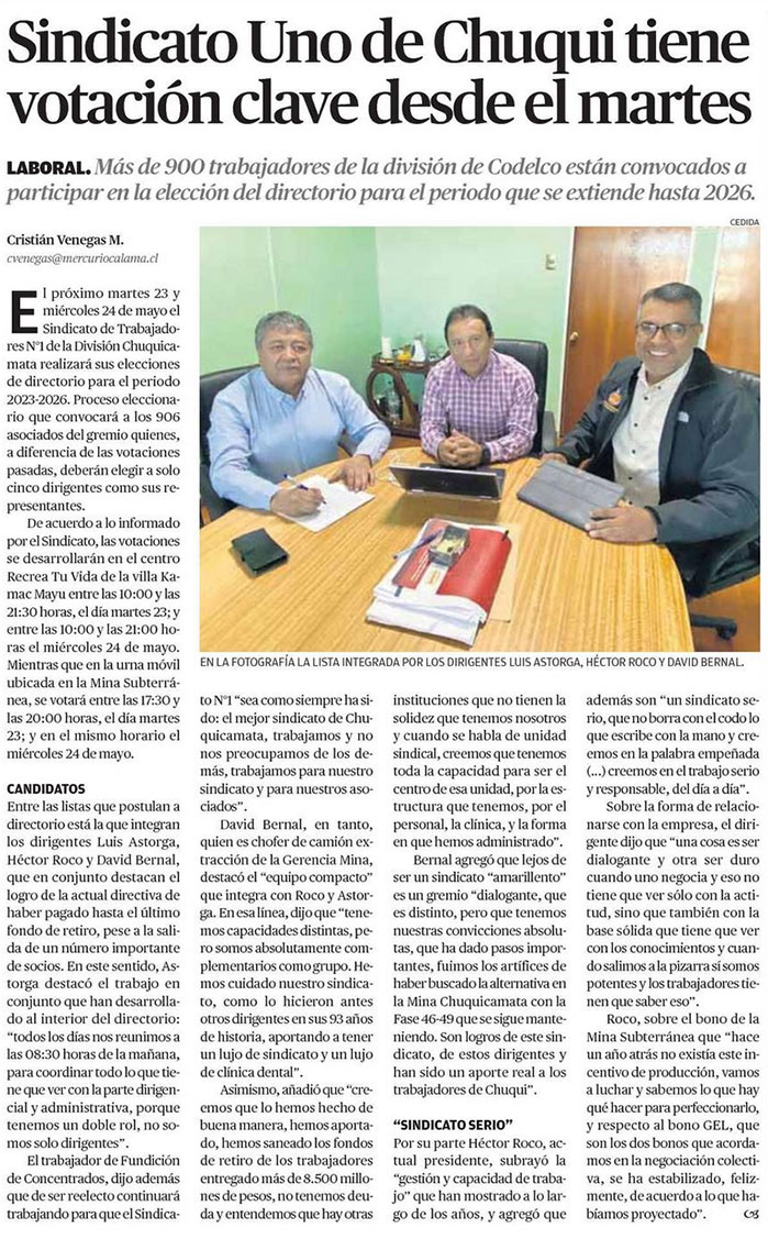 Diez postulantes buscan un cupo en el próximo directorio del Sindicato 1 - (El Mercurio de Calama)