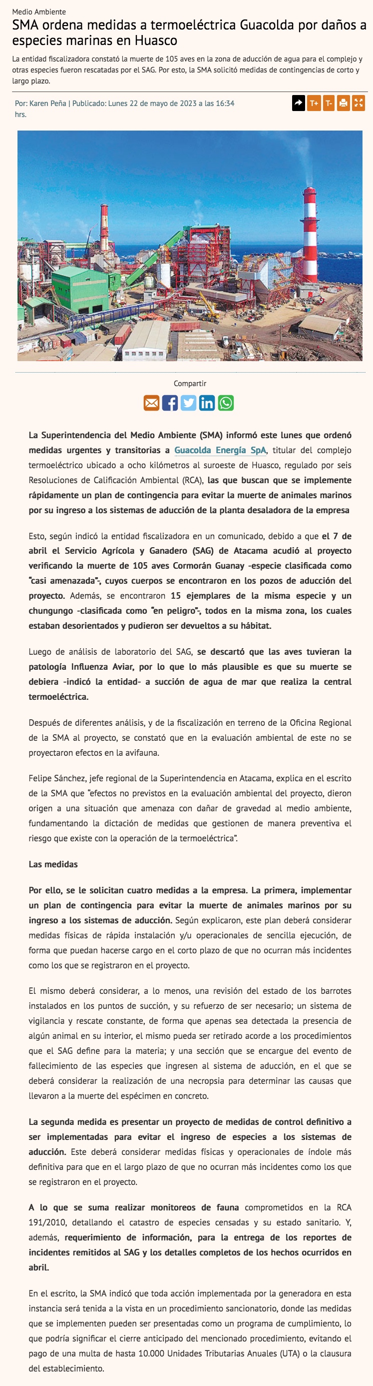 Más de cien aves murieron en la termoeléctrica Guacolda y la SMA ordenó medidas urgentes - (El Diario de Atacama)