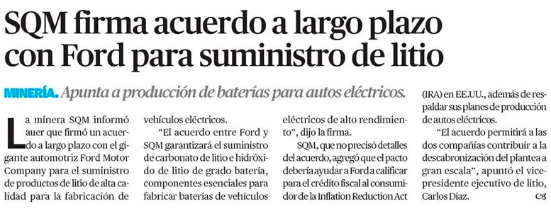 SQM y Albemarle anuncian acuerdos de suministro de litio con fabricante de autos Ford - (El Mercurio de Santiago)