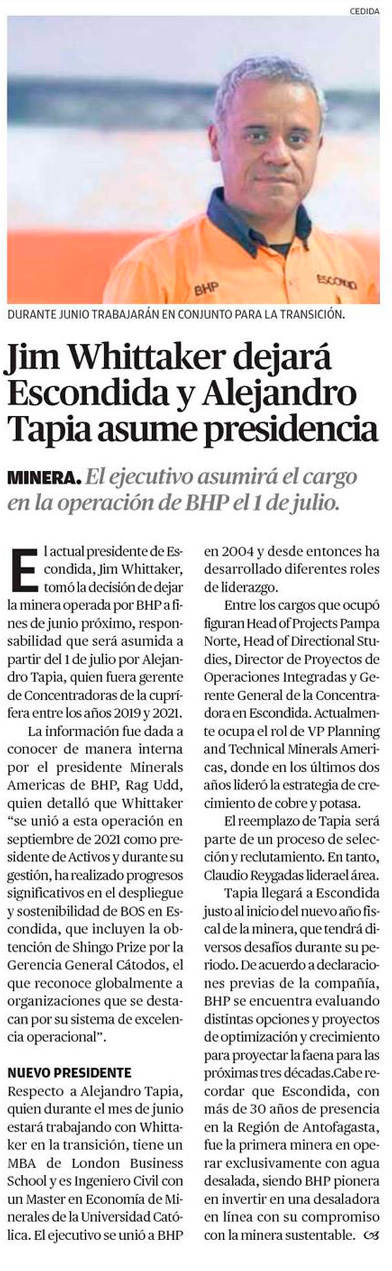 Nombran a nuevo líder de Minera Escondida - (El Mercurio de Santiago)