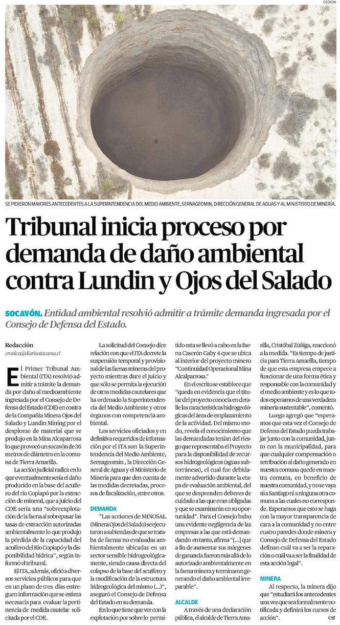 Admiten a trĂ¡mite demanda en contra de minera Ojos del Salado - (El Mercurio de Santiago)