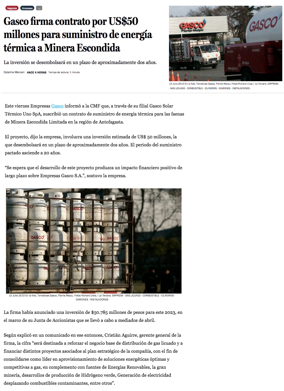 Empresas Gasco firma contrato de suministro de energía térmica para Minera Escondida por US$ 50 millones - (DF Online)