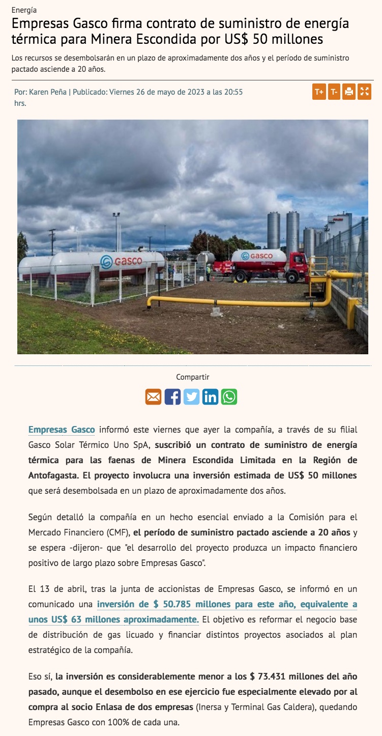 Gasco firma contrato por US$50 millones para suministro de energía térmica a Minera Escondida - (Pulso Online)