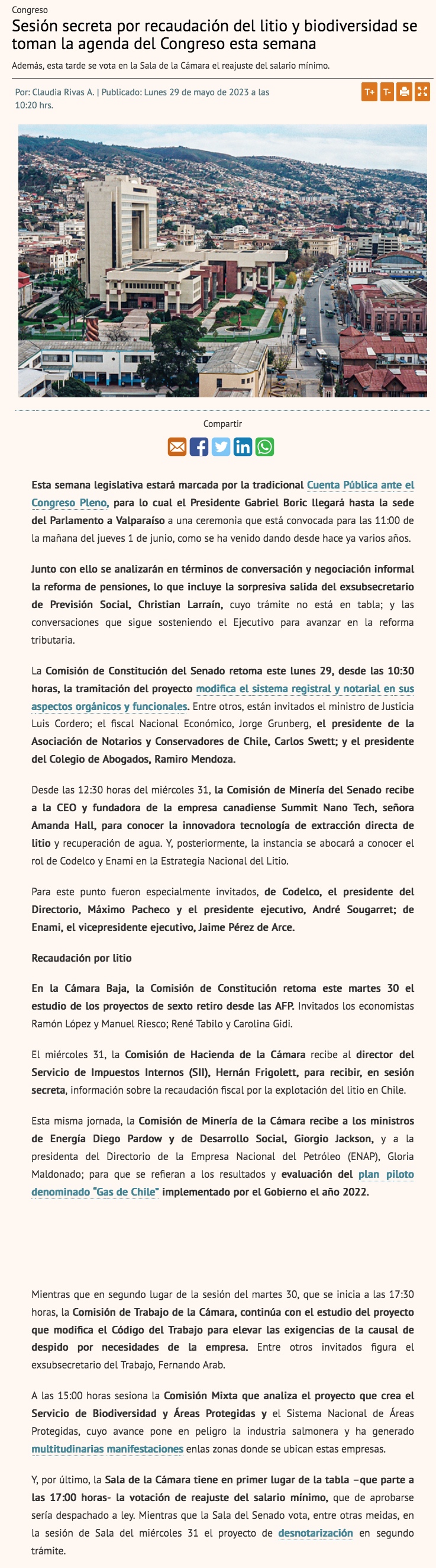 En sesión secreta ante la comisión de Hacienda de la Cámara de Diputados, el SII expondrá recaudación fiscal por la explotación del litio - (El Mercurio de Santiago)
