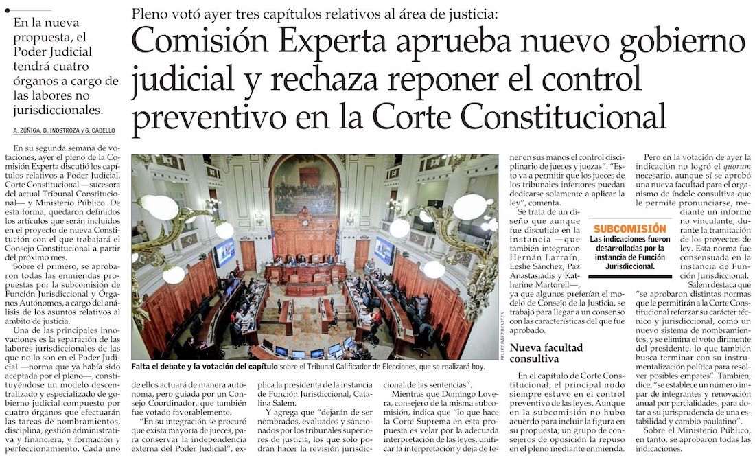 Comisión Experta aprueba nueva estructura de gobierno para el Poder Judicial y normas de organismo que reemplaza al TC - (La Tercera)