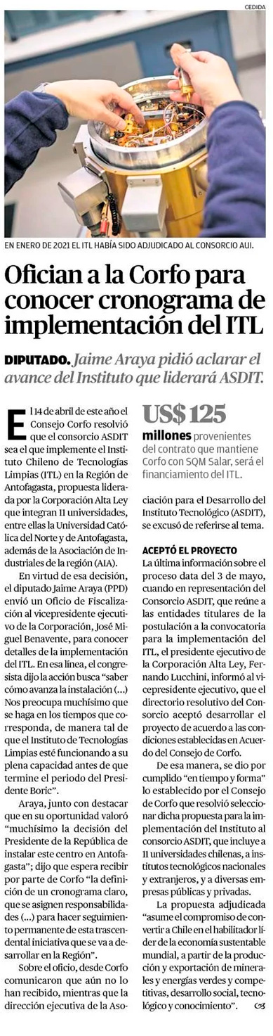 Diputado de Antofagasta pide a Corfo cronograma “claro” sobre la implementación del ITL y seguimiento permanente del proyecto - (soyantofagasta)