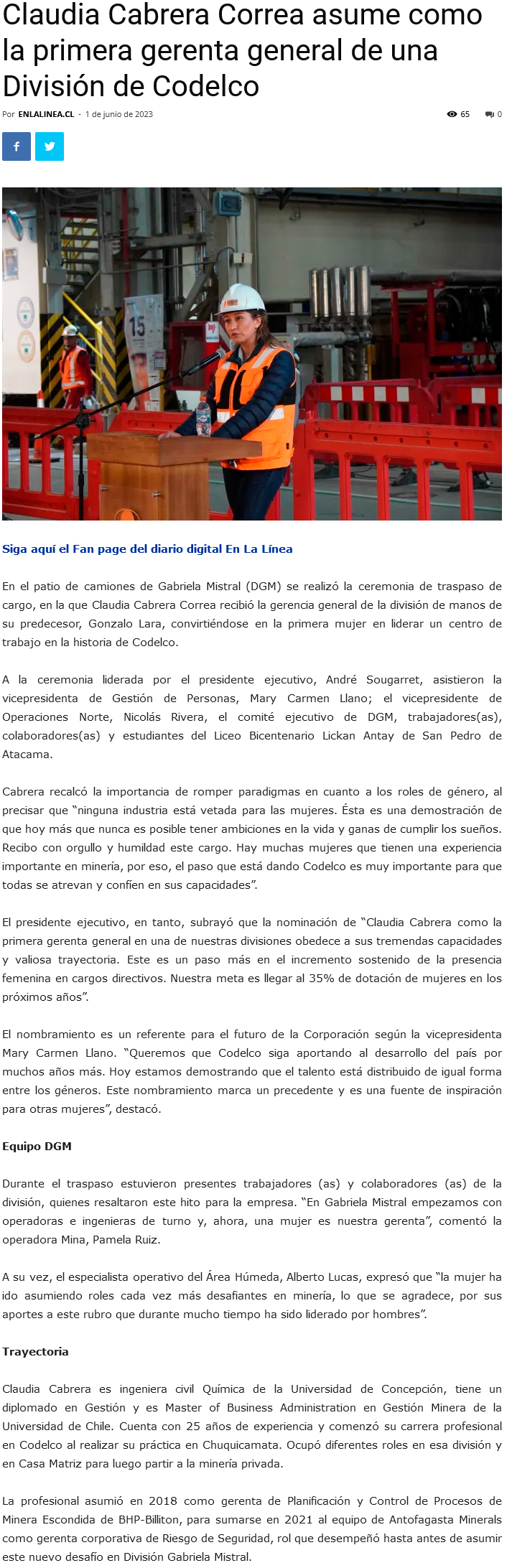 Primera mujer gerente de una minera: Claudia Cabrera Correa asume como la primera gerenta general Mina Gabriela Mistral - (elamerica)