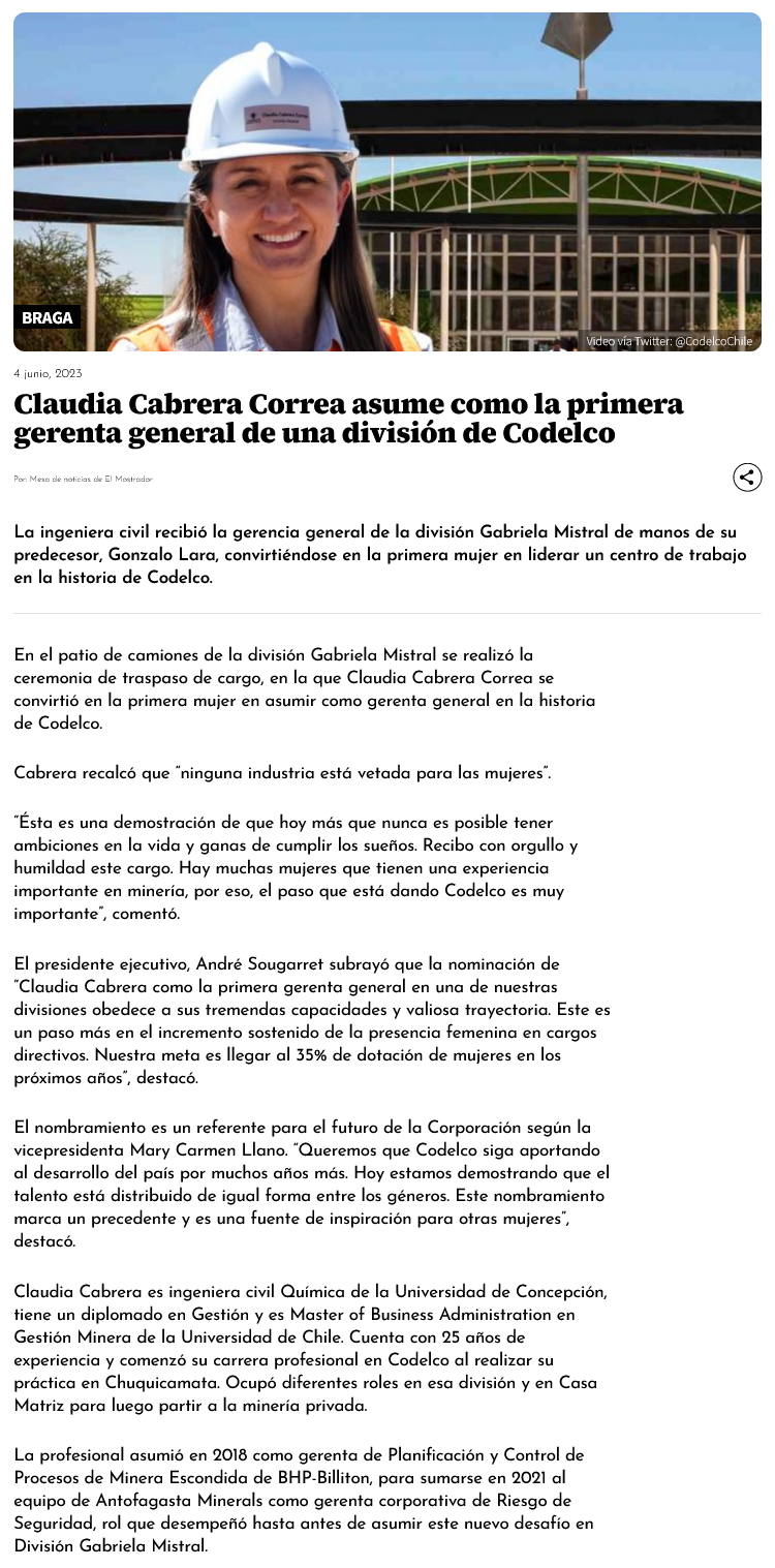 Codelco hace historia al nombrar a Claudia Cabrera como gerenta general de la División Gabriela Mistral - (poderyliderazgo)
