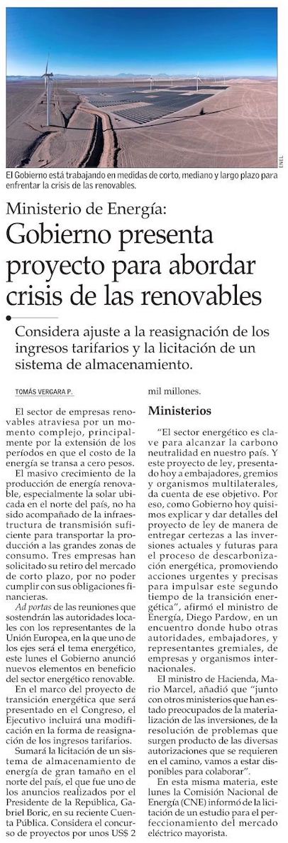 Pardow y Marcel plantean propuestas para enfrentar crisis de las renovables, pero enfrentan reparos de gremios y embajadores - (Pulso)