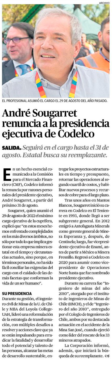 André Sougarret deja la presidencia ejecutiva Codelco: duró solo un año en el cargo - (Pulso Online)