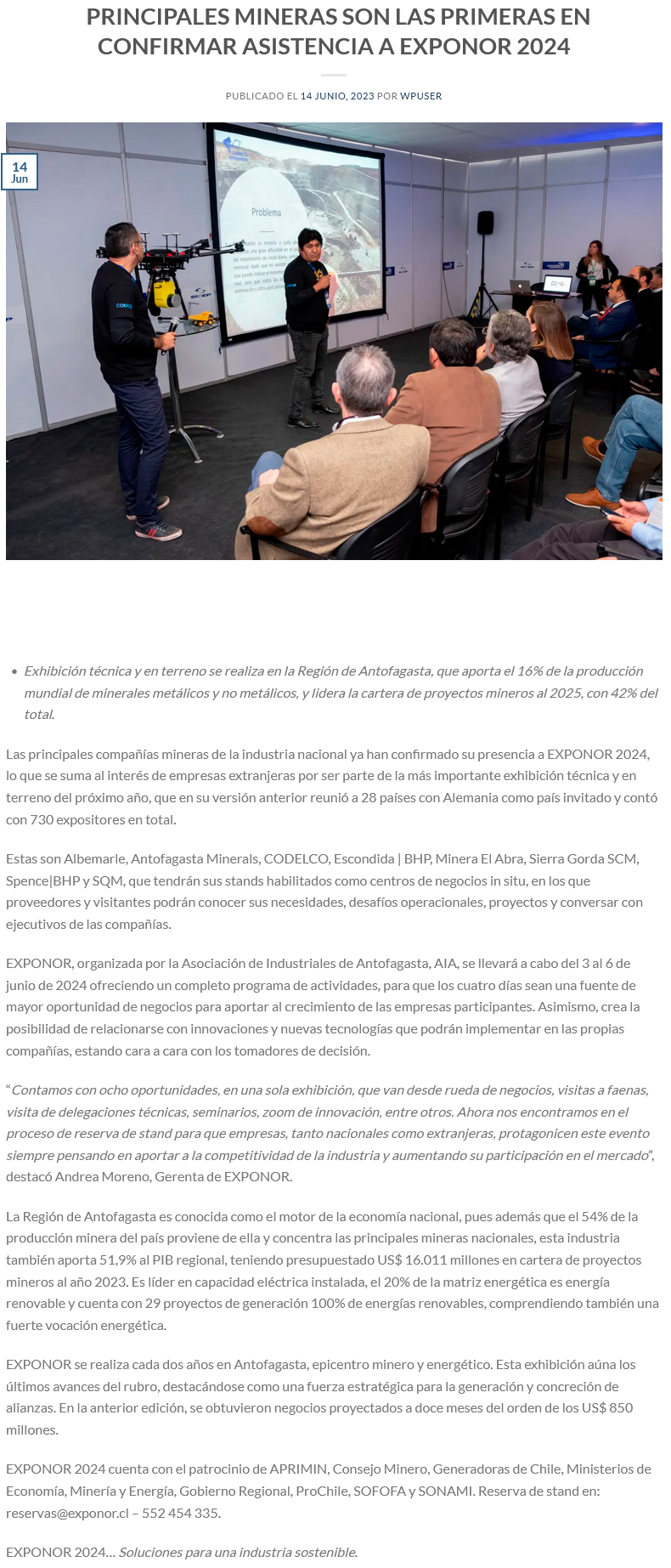 Principales compañías mineras nacionales confirman presencia en Exponor 2024 - (mch.cl)