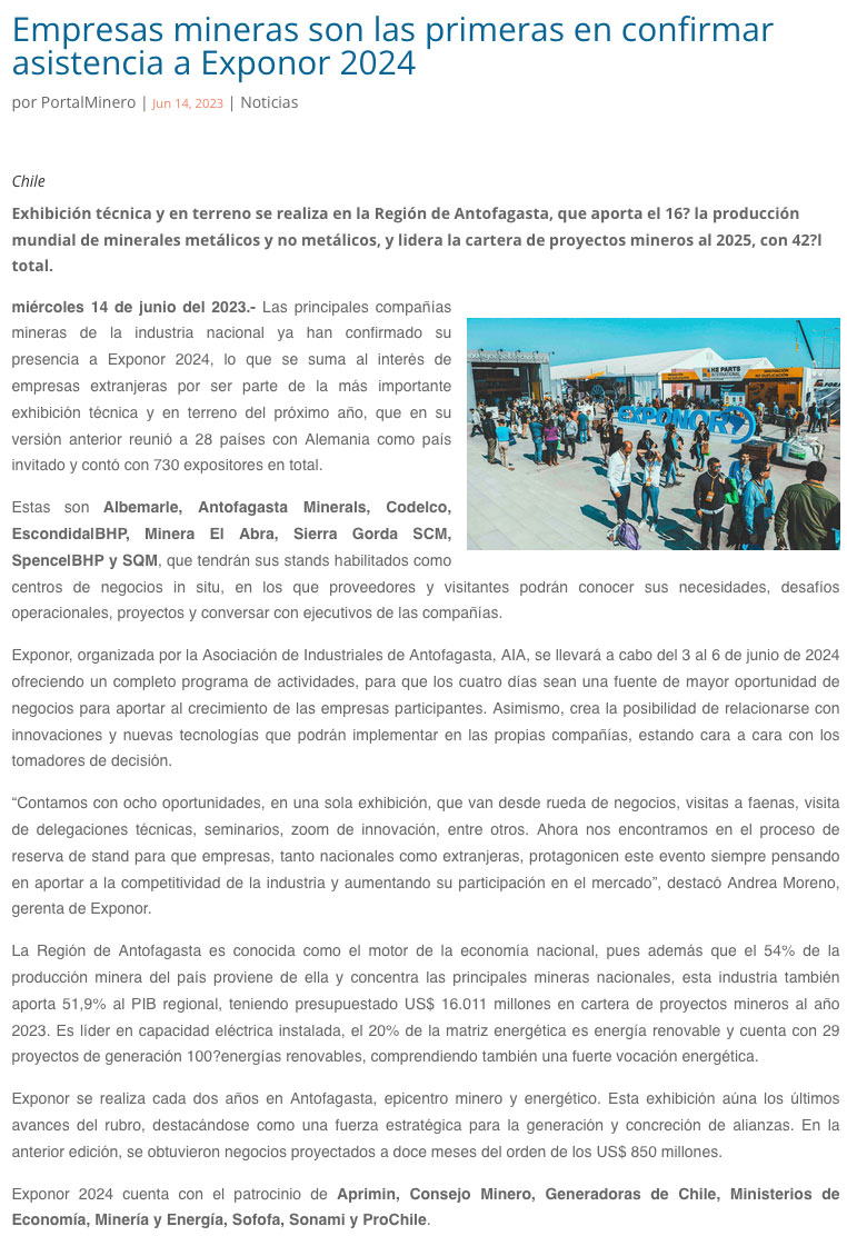 Principales mineras son las primeras en confirmar asistencia a Exponor 2024 - (mvcomunicaciones.cl)