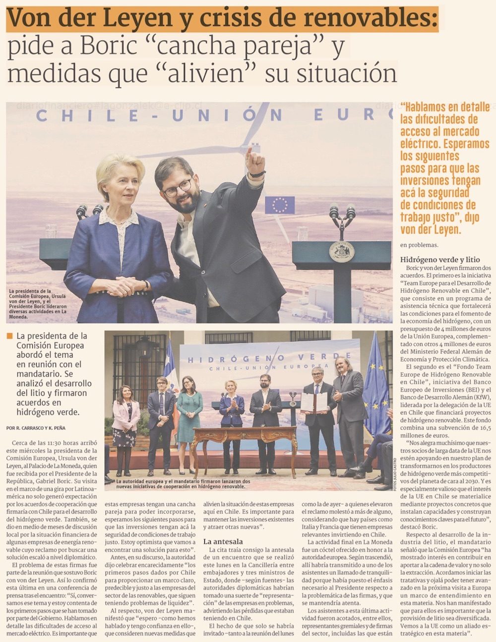 Gobierno firma acuerdo con la Unión Europea para impulsar desarrollo del hidrógeno verde en el país - (El Mercurio de Santiago)