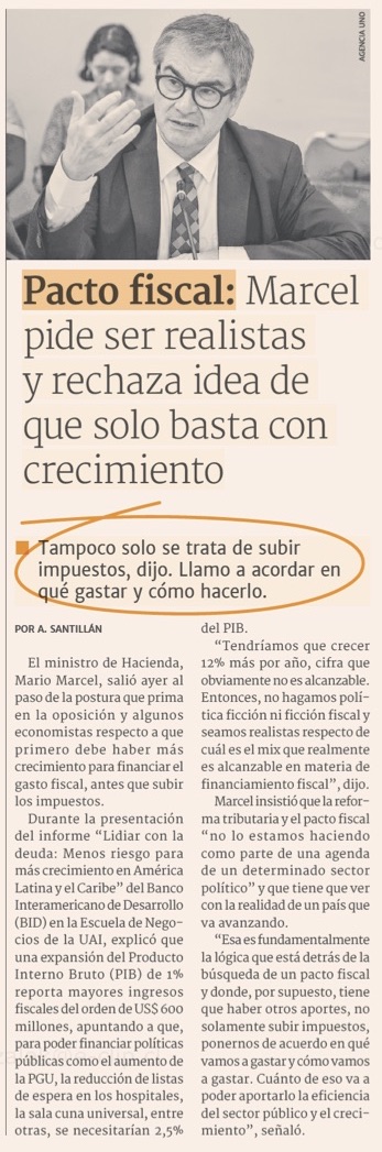 Ministro Marcel afirma que mayor crecimiento no es suficiente para poder financiar las necesidades del paĆs - (El Mercurio de Santiago)