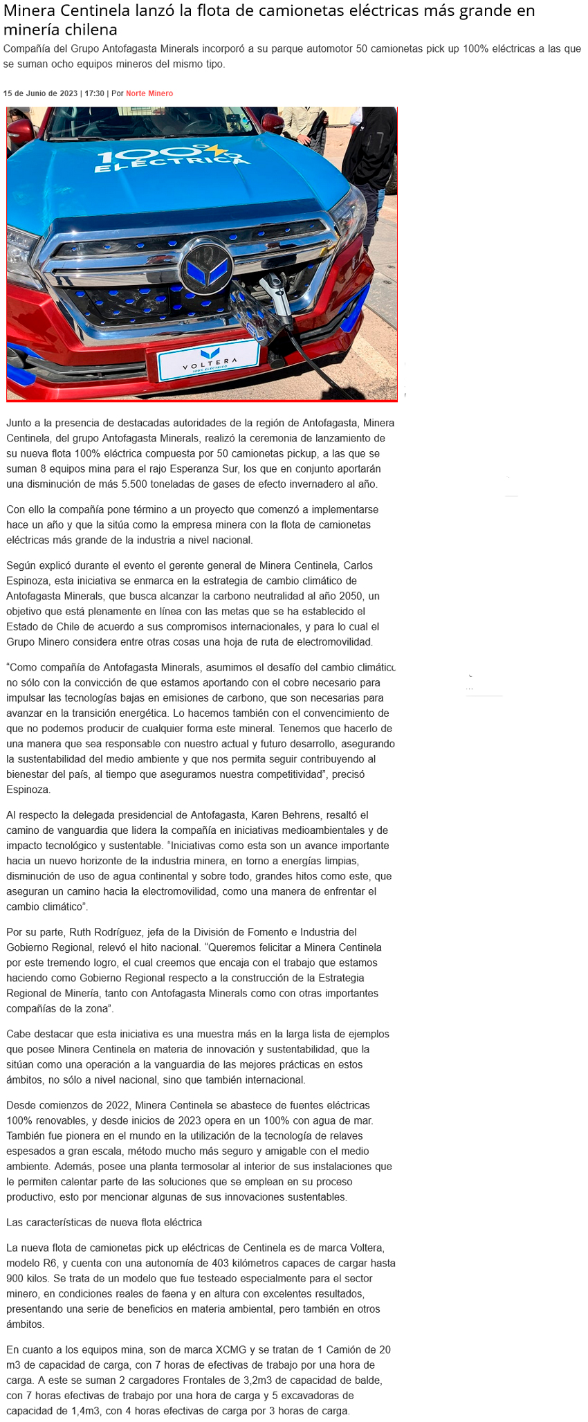 Centinela implementa la flota de camionetas eléctricas más grande de la industria minera - (El Mercurio de Antofagasta)