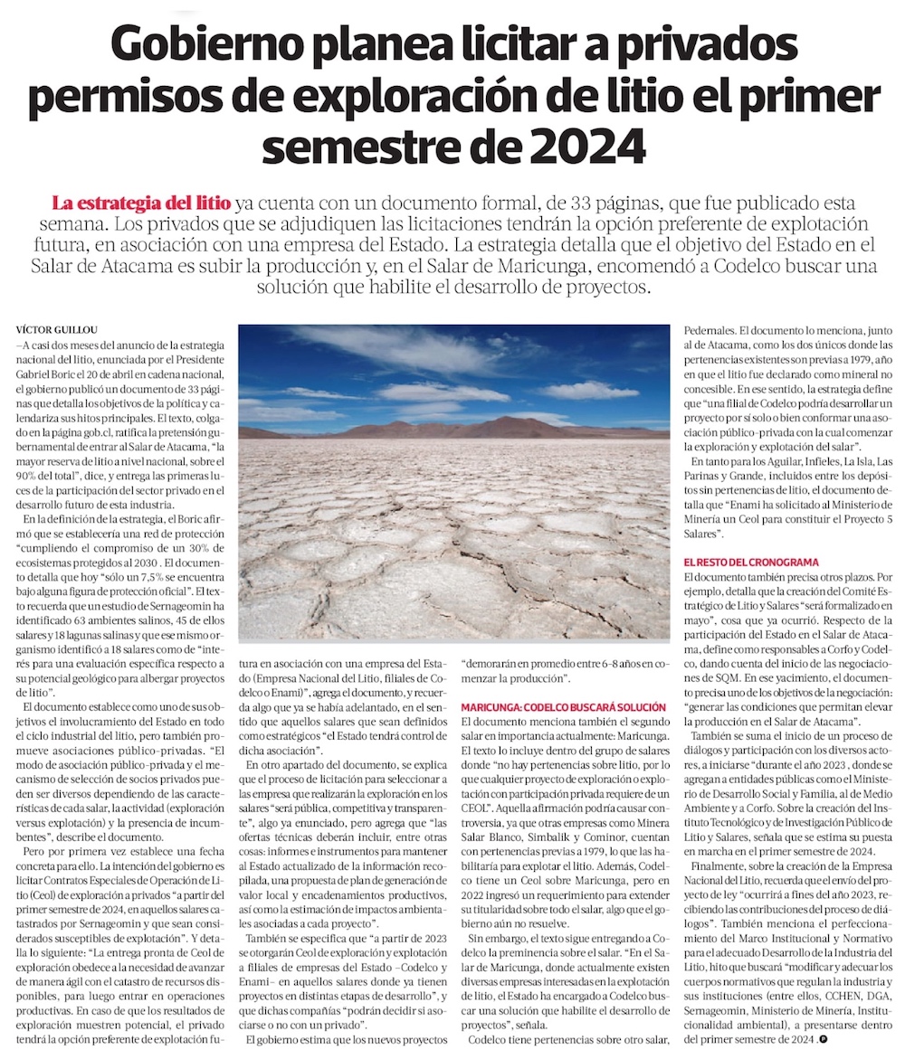 Litio: Licitación de permisos para la exploración de privados comenzará en 2024 - (El Mercurio de Santiago)