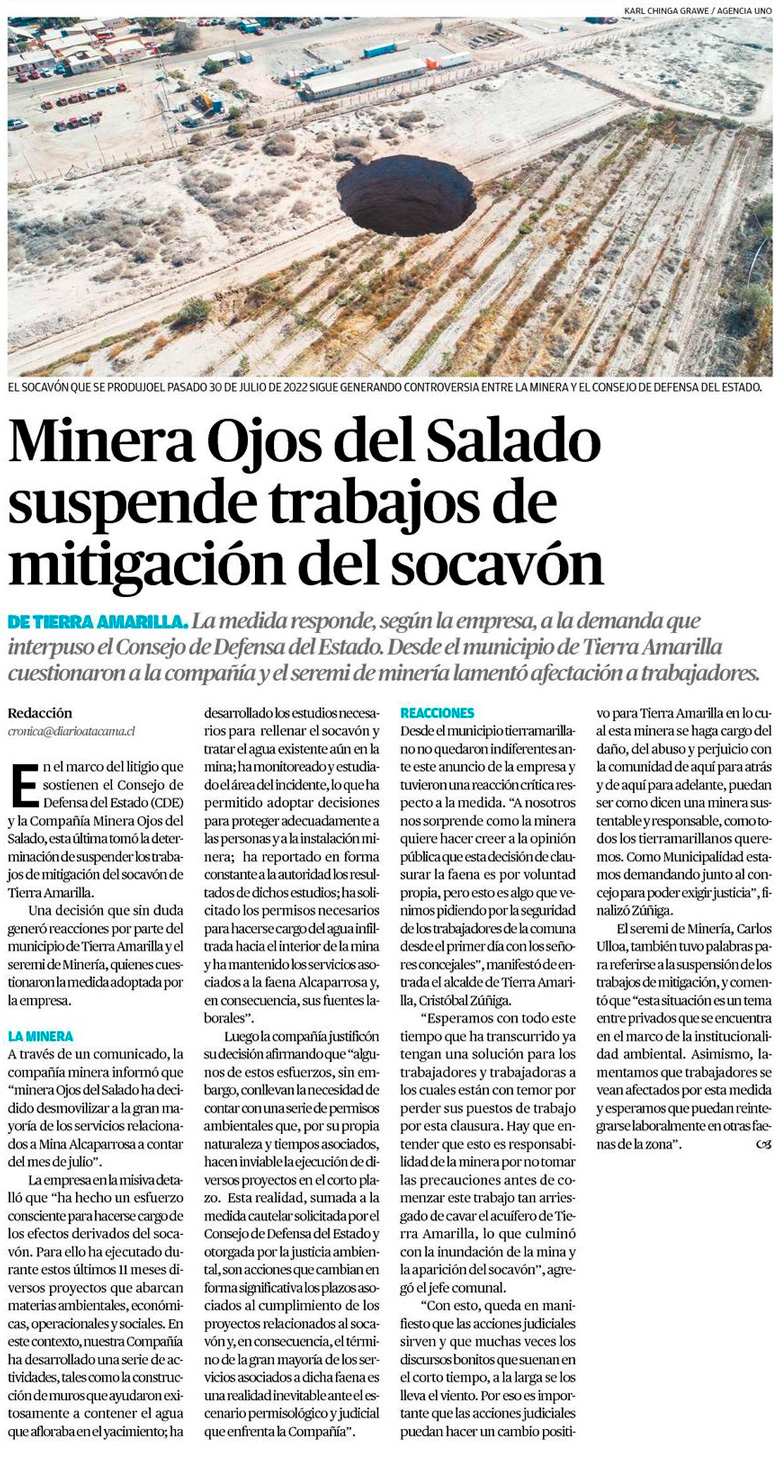 Minera Ojos del Salado suspende obras de mitigación por socavón - (El Mercurio de Santiago)