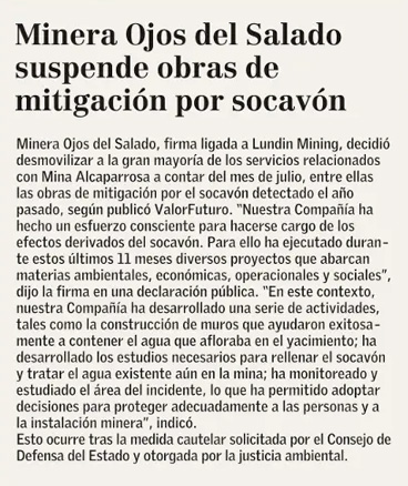 Minera Ojos del Salado suspende trabajos de mitigación del socavón - (El Diario de Atacama)