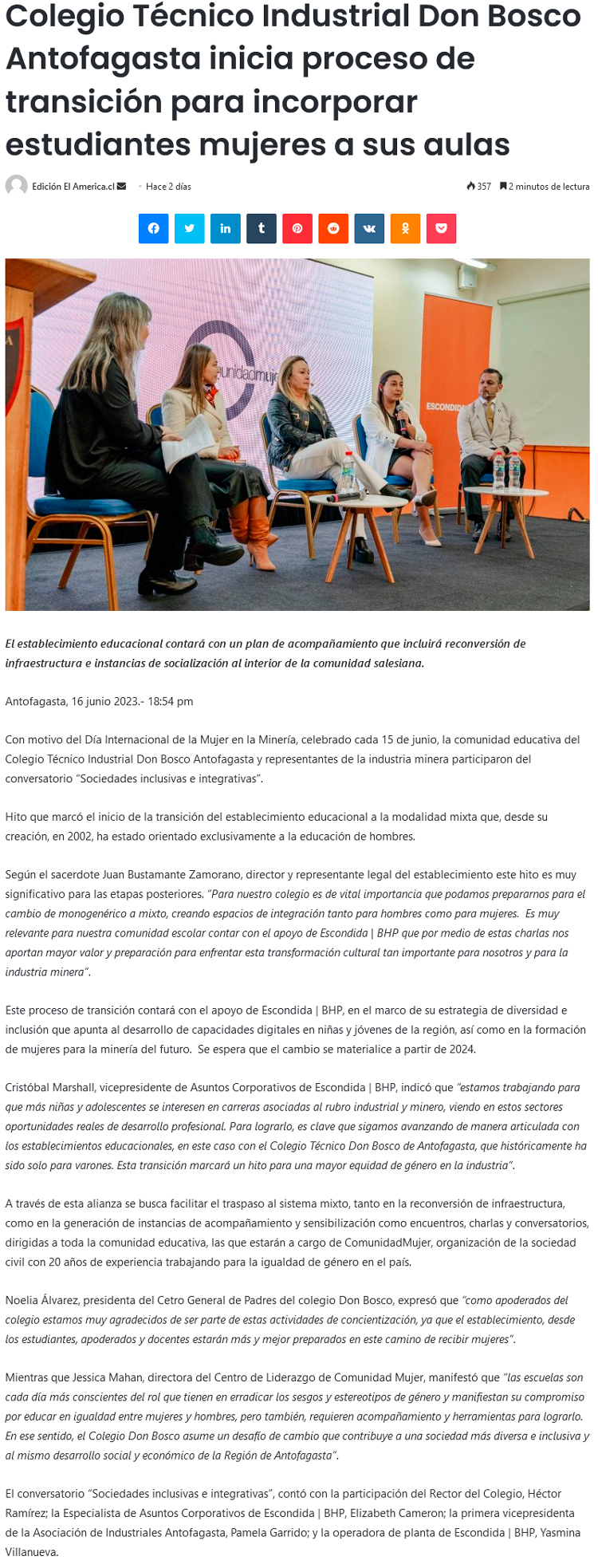 Escondida | BHP apoyará a Colegio Don Bosco en la incorporación de alumnas al establecimiento - (mch.cl)