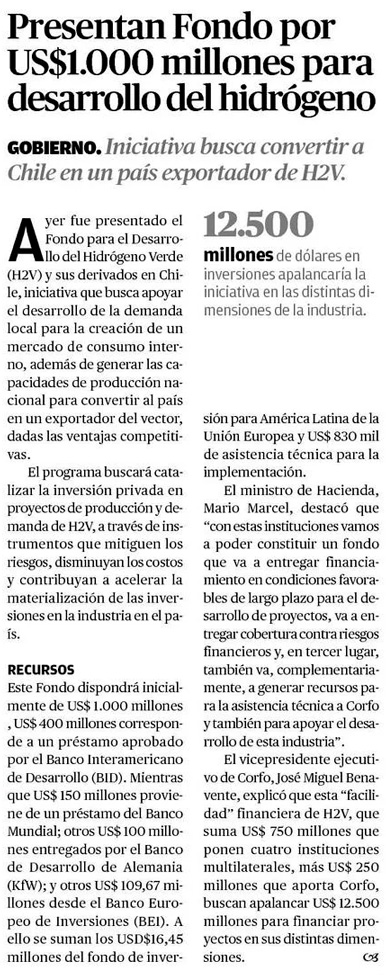 Gobierno anuncia fondo de US$ 1.000 millones para impulsar hidrĂ³geno verde - (Diario Financiero)