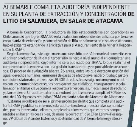 Albemarle completa auditoría independiente bajo estándar IRMA - (mch.cl)
