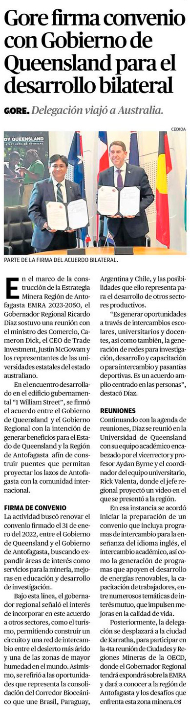 Gobierno Regional de Antofagasta firma convenio con Gobierno de Queensland-Australia para fortalecer e impulsar el desarrollo bilateral - (region2)