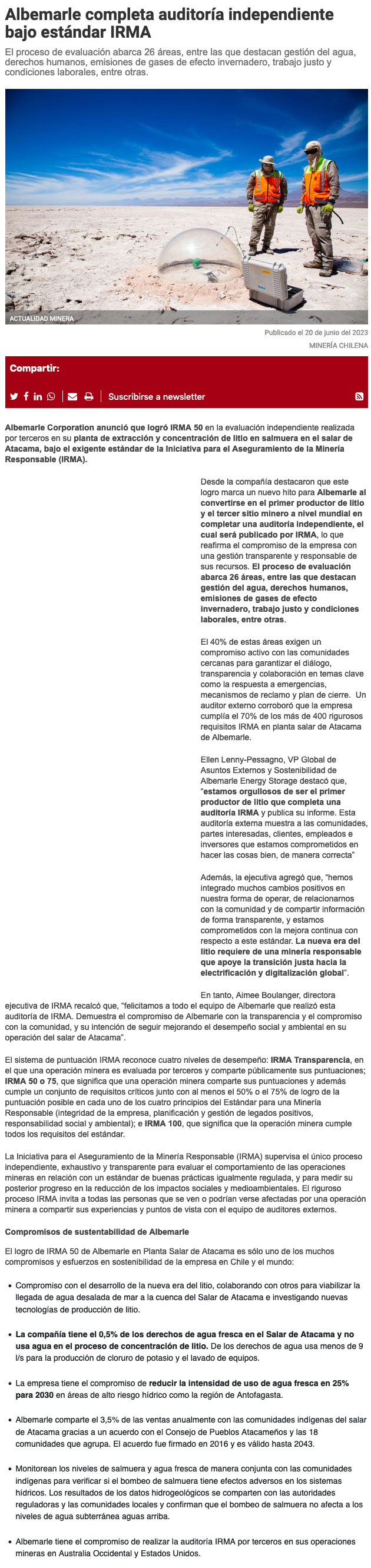 Albemarle completa auditoría independiente en su planta de extracción y concentración de litio en salmuera, en salar de Atacama - (El Mercurio de Santiago)
