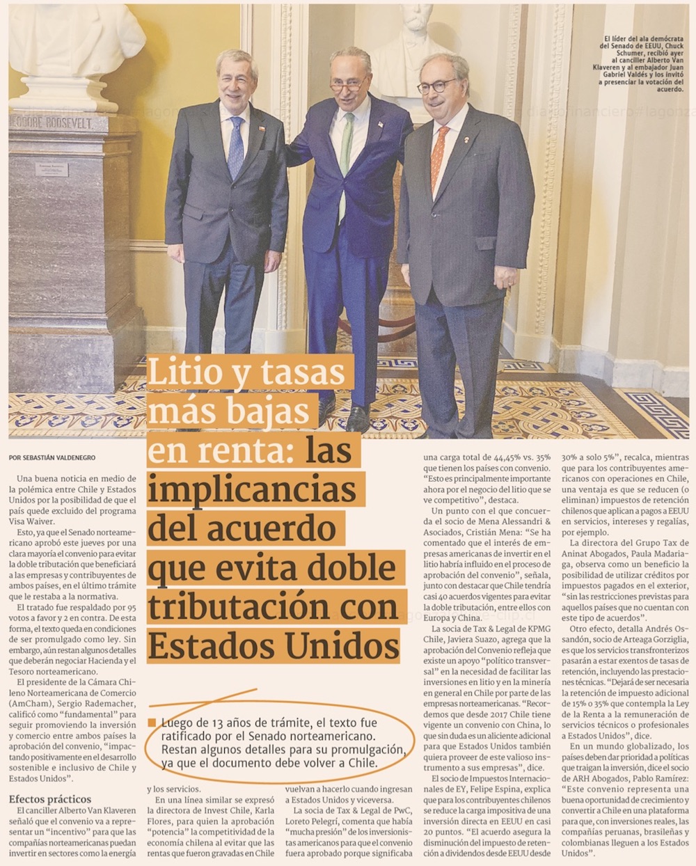 Los efectos de la aprobación del convenio de doble tributación entre Chile y EE.UU. - (El Mercurio de Santiago)