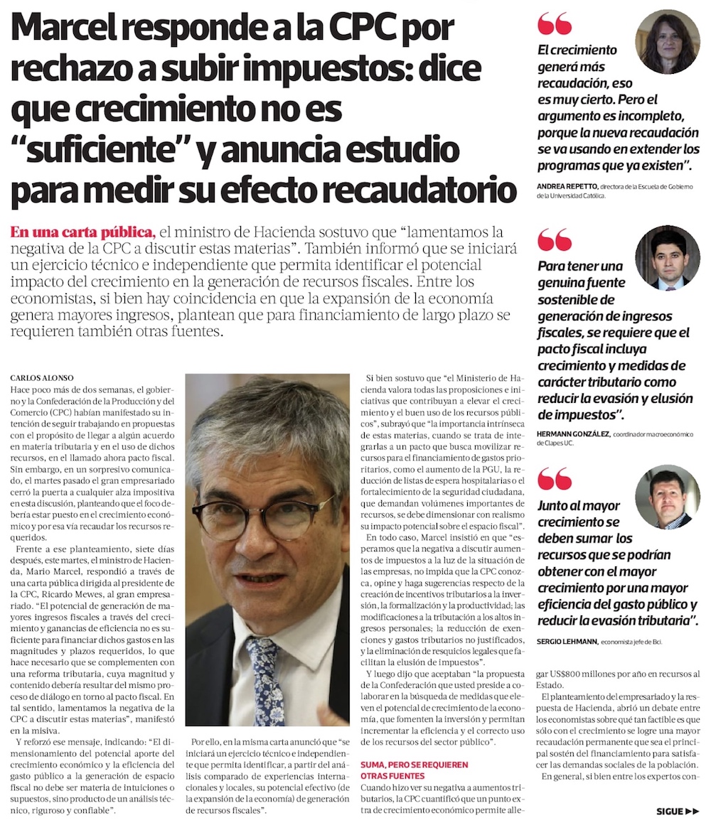 Hacienda responde a la CPC: el crecimiento “no es suficiente” para financiar más gastos - (El Mercurio de Santiago)