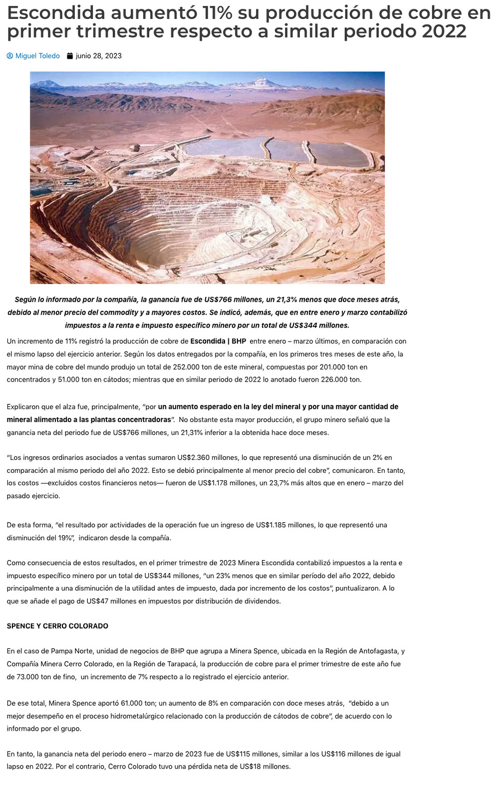 Ganancias de Minera Escondida bajaron 21% y llegan a US$ 766 millones a marzo de 2023 - (DF Online)
