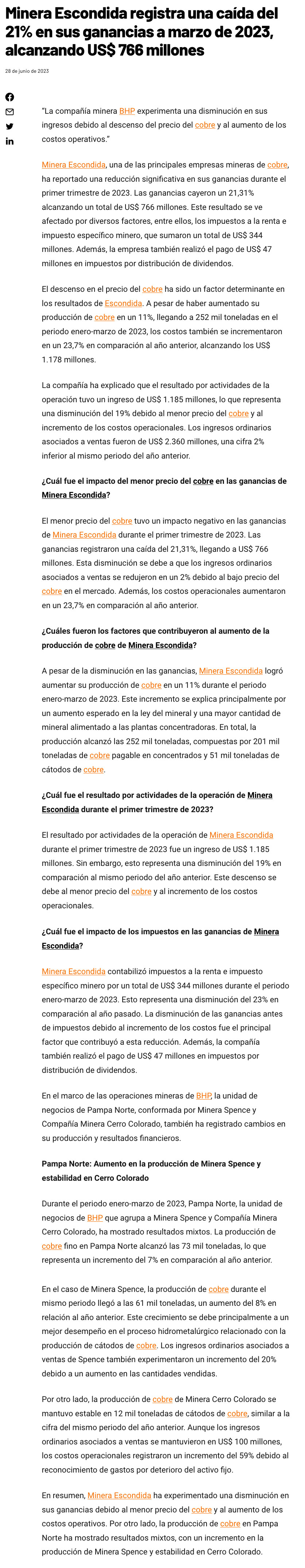 Ganancias de Minera Escondida bajaron 21% y llegan a US$ 766 millones a marzo de 2023 - (DF Online)
