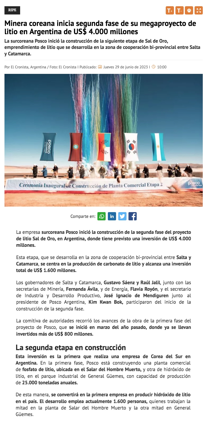 Posco inicia construcción de la segunda fase del proyecto de litio Sal de Oro en Argentina - (reporteminero)