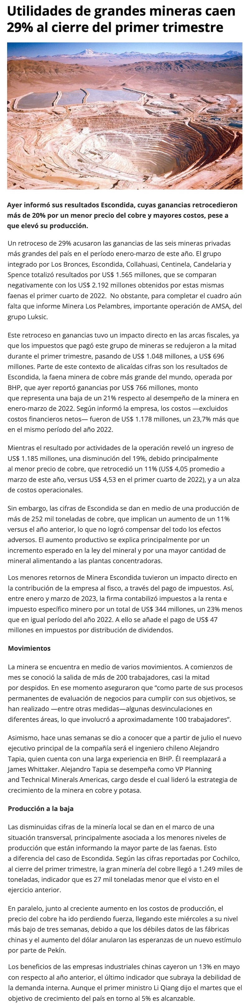 Escondida aumenta producción, pero baja ganancias en 22% por menor precio del cobre - (norteminero online)
