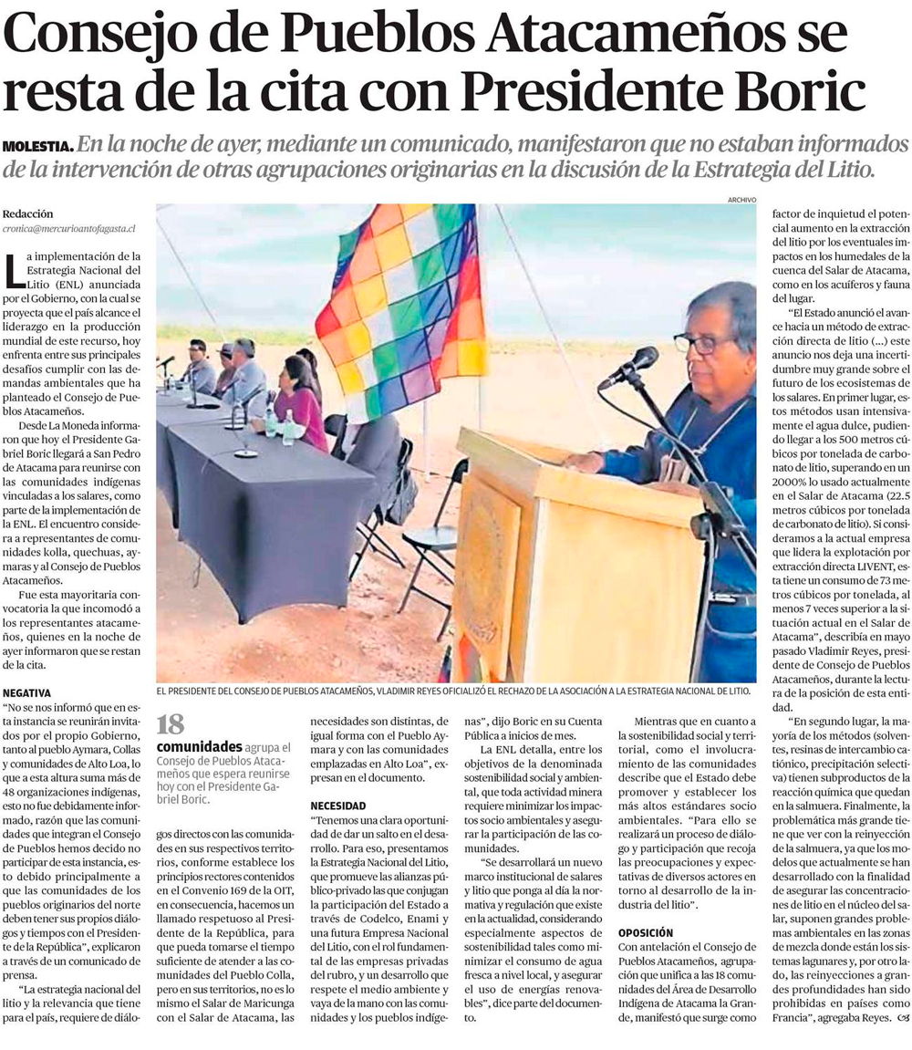 Atacameños deciden no participar en reunión con el Presidente Boric - (El Mercurio de Santiago)