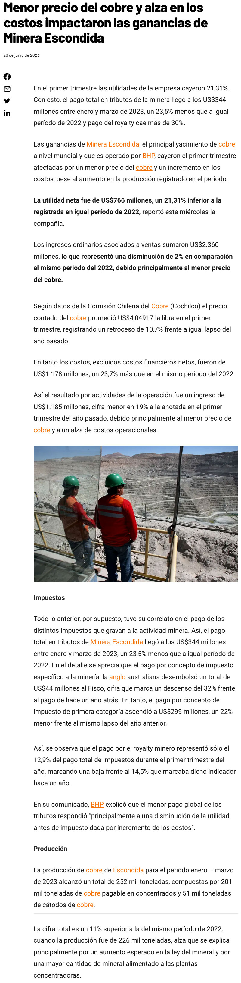Escondida aumenta producción, pero baja ganancias en 22% por menor precio del cobre - (norteminero online)