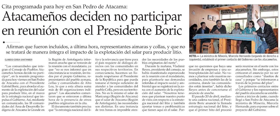 Consejo de Pueblos AtacameƱos se resta de la cita con Presidente Boric - (El Mercurio de Calama)