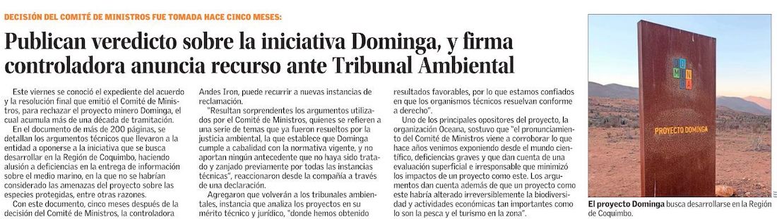 Minera Dominga: SEA emite informe de rechazo de Comité de Ministros y empresa confirma que apelará ante la justicia - (DF Online)