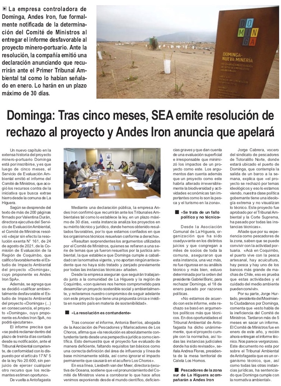 Minera Dominga: SEA emite informe de rechazo de Comité de Ministros y empresa confirma que apelará ante la justicia - (DF Online)