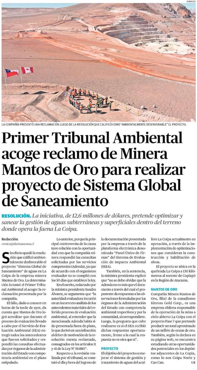 Primer Tribunal Ambiental acoge reclamo de Minera Mantos de Oro y podrá realizar proyecto de Sistema Global de Saneamiento - (El Chañarcillo)