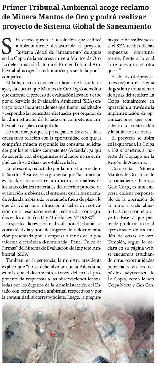 Primer Tribunal Ambiental acoge reclamo de Minera Mantos de Oro para realizar proyecto de Sistema Global de Saneamiento - (El Diario de Atacama)