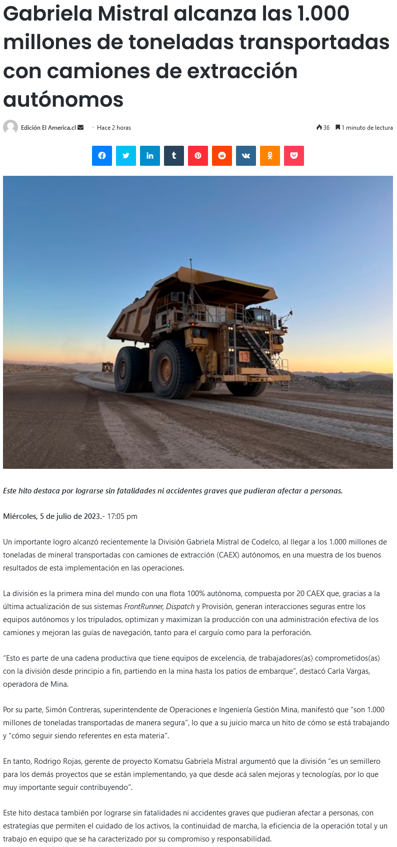Caex autónomos de DGM alcanzan mil millones de toneladas transportadas - (El Mercurio de Calama)