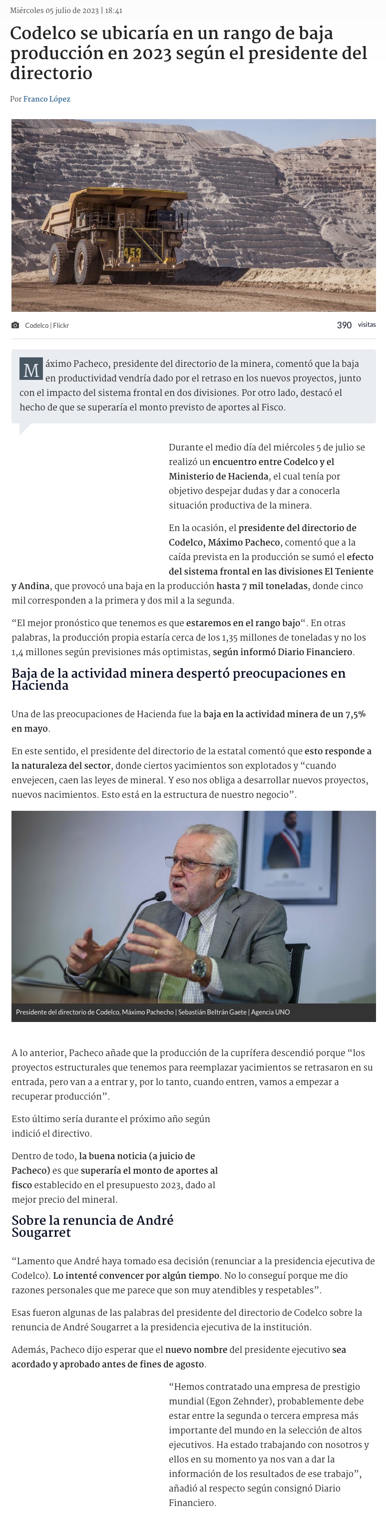 Pacheco tras reunión con Hacienda: “vamos a estar en el rango bajo de producción este año” - (Diario Financiero)