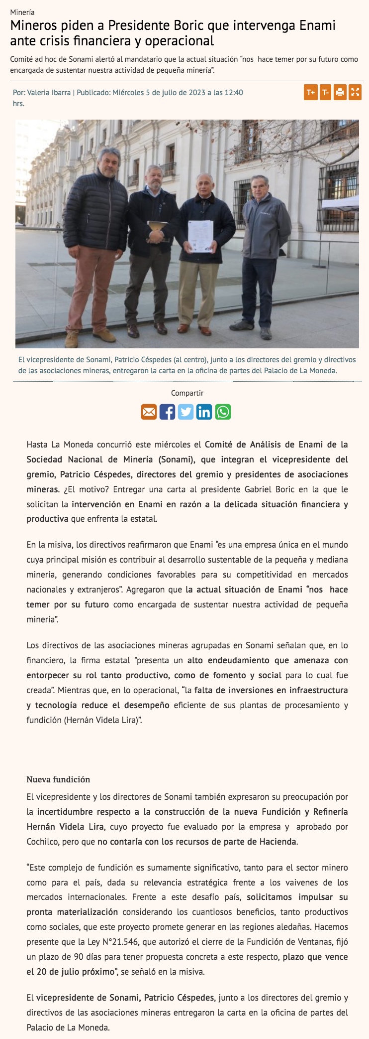 Sonami pide intervención del Gobierno en Enami y Cámara aprueba comisión investigadora - (El Mercurio de Santiago)