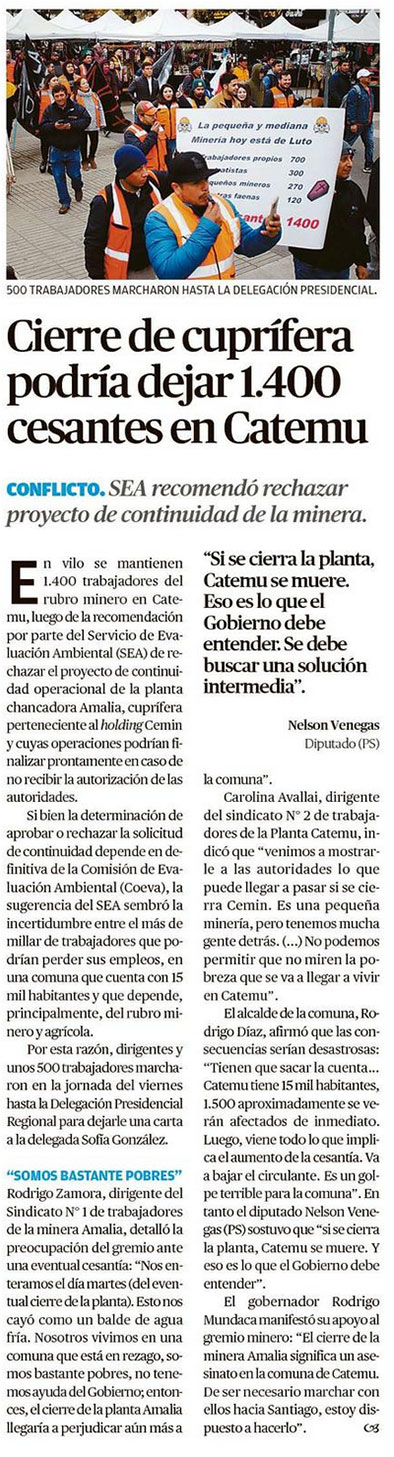 "Sin la aprobación de la continuidad de la planta (en Catemu), la operación debe comenzar su cierre definitivo" - (El Mercurio de Valparaíso)