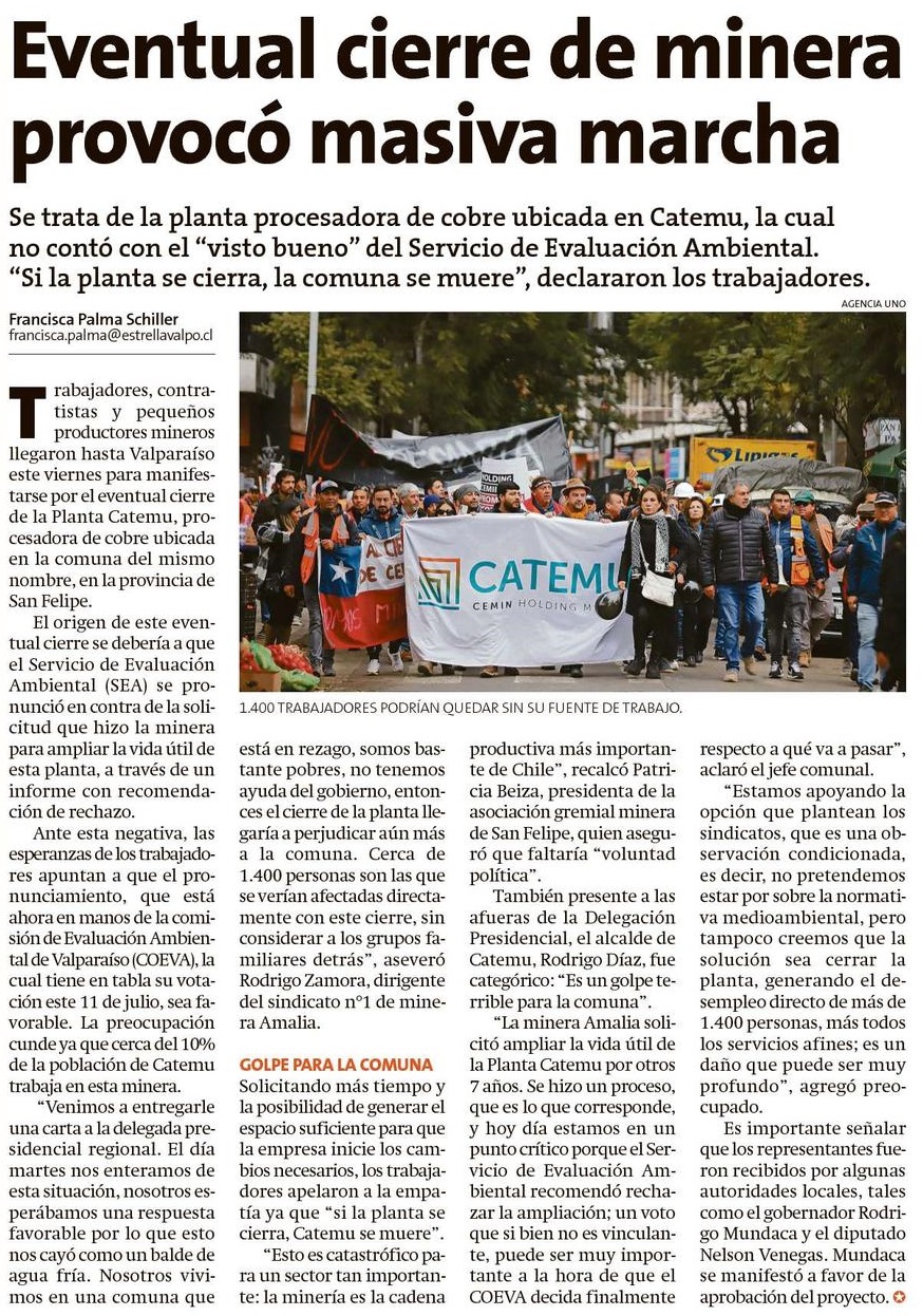 Cierre de cuprífera podría dejar 1.400 cesantes en Catemu - (El Mercurio de Valparaíso)