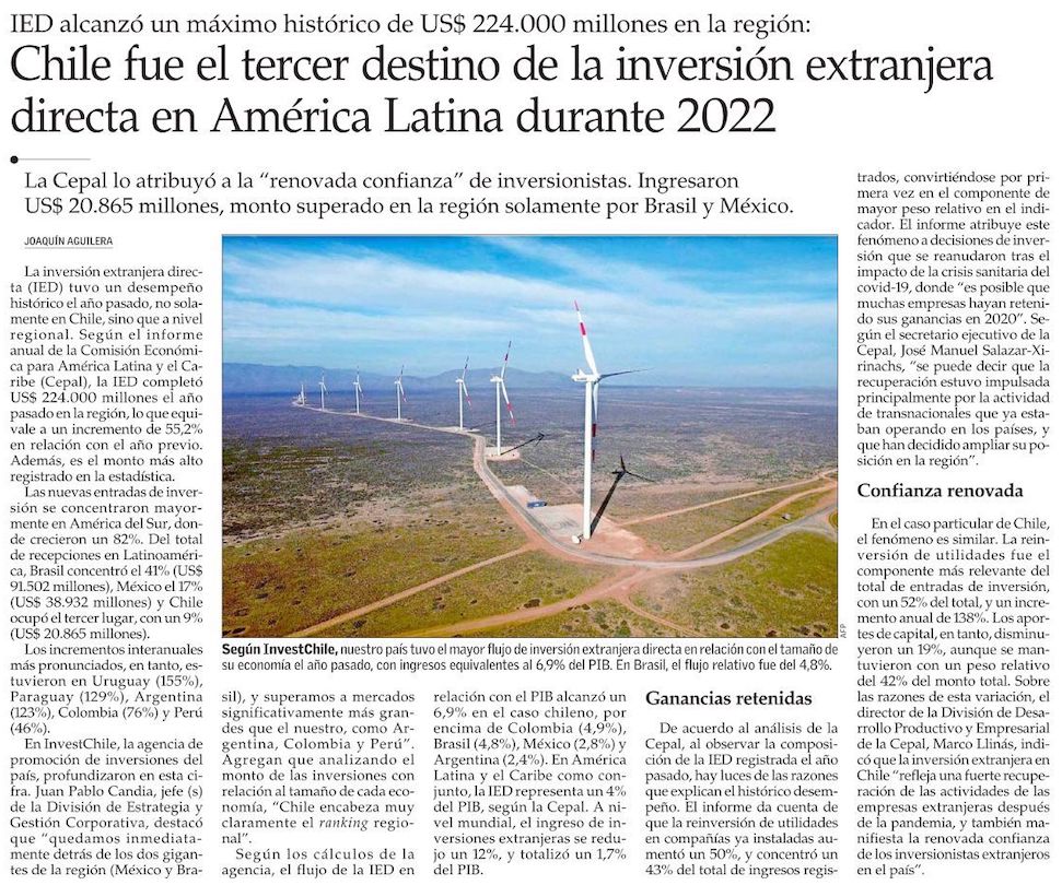 Cepal: Chile fue el tercer país receptor de inversión extranjera directa en América Latina en 2022 - (Pulso)