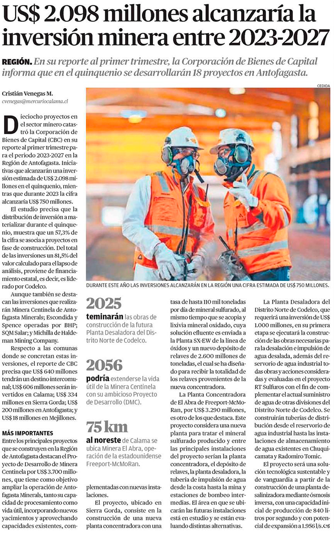 US$ 2.098 millones alcanzaría la inversión minera entre 2023-2027 - (El Mercurio de Antofagasta)